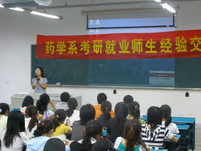 5月31日,药学系在西102教室举办了“考研、就业师生经验交流会” ,面临考研和就业的2005级药学专业学生积极踊跃参加了本次活动,同时也吸引了药学系很多2006、2007级学生。这是药学系毕业生文明离校的系列活动之一。药学系秘书兼2004级辅导员李康才老师、药分与药化教研室惠斌老师以及2004级药学专业成功考研或就业的部分学生应邀参加了交流会,2005级药学辅导员王国栋老师主持了本次交流会。