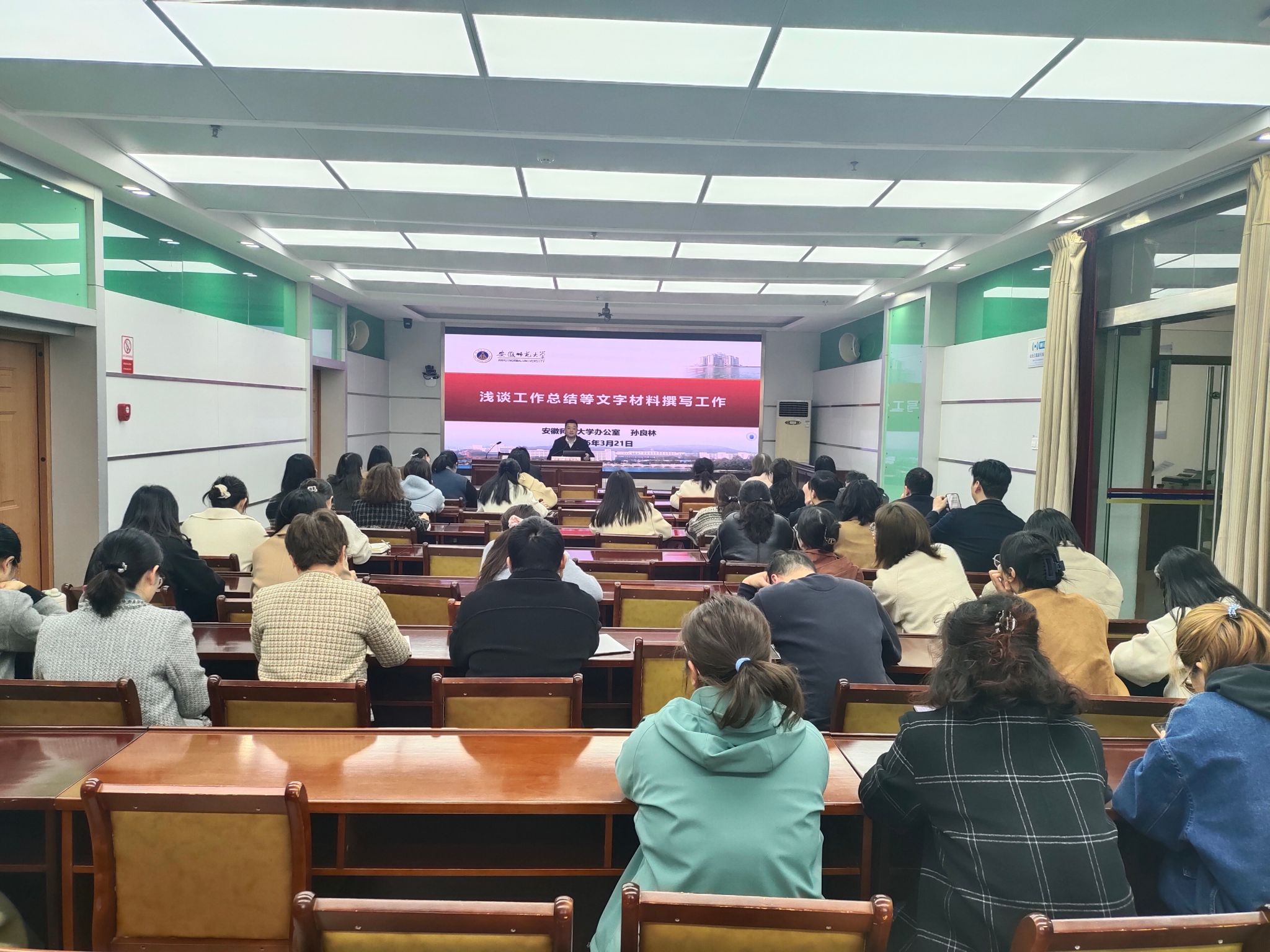 为进一步提升我校青年干部的文字材料撰写能力,3月21日,组织部、机关党委联合举办第四期青年干部培训讲座,邀请安徽师范大学办公室副主任孙良林作“浅谈工作总结等文字材料撰写工作”专题辅导讲座,全校近80名青年干部参加。讲座由组织部副部长、机关党委书记任苔蓉主持。