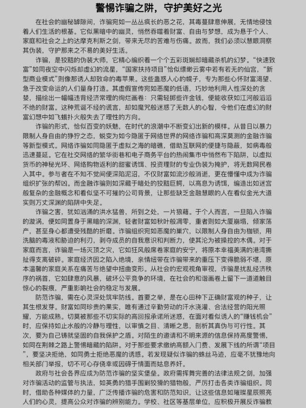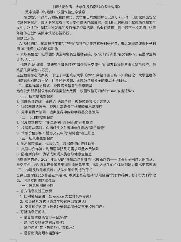 为进一步增强学生防范诈骗意识,营造安全和谐的校园环境,筑牢校园安全防线,3月17日至4月1日,公共卫生学院以“校园无诈,青春无忧”为主题举办了第二届校园反诈作品征集大赛。