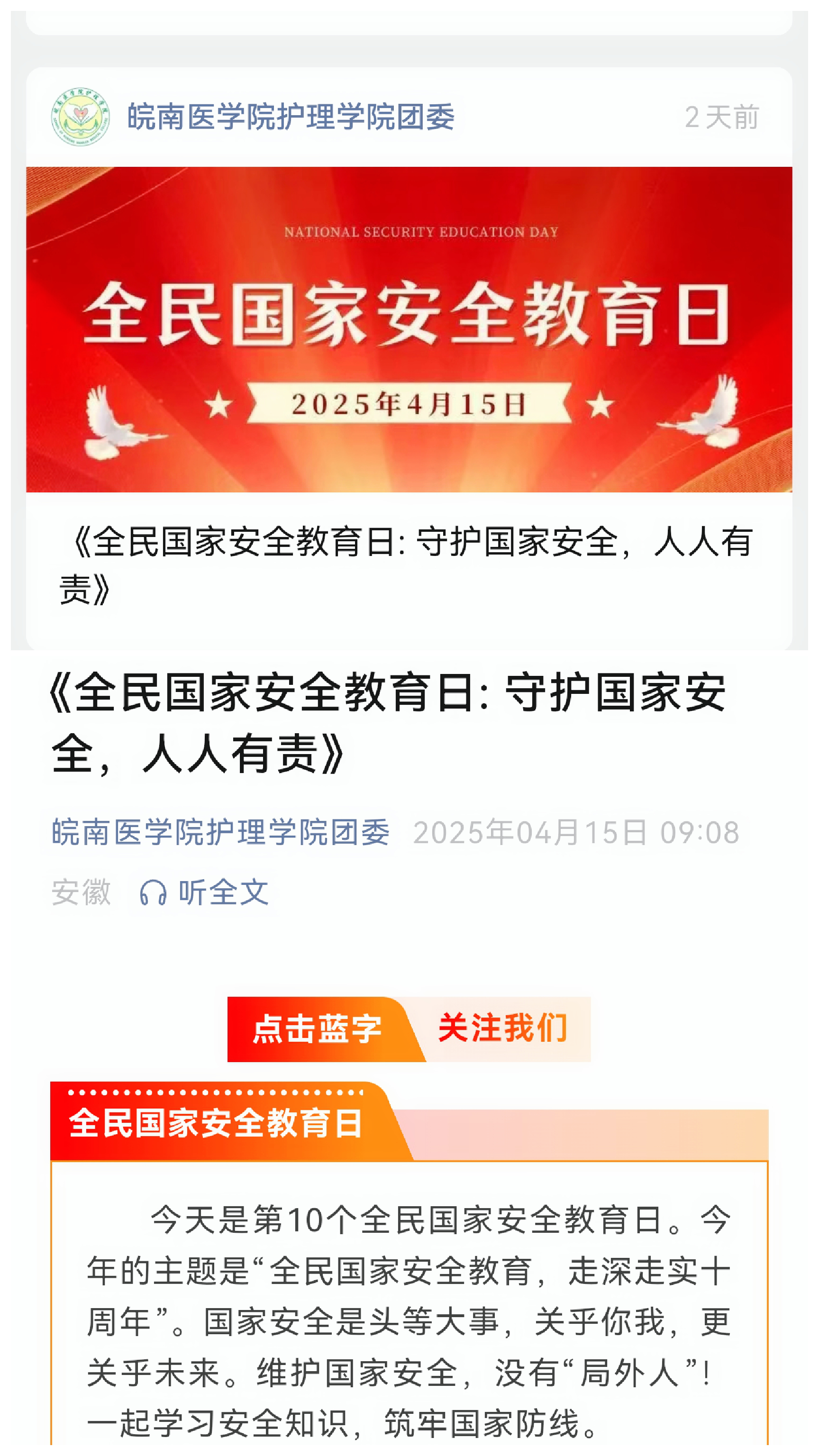 线上宣传,公众号打造国家安全课。学院团委微信公众号发布专题推文《全民国家安全教育日:守护国家安全,人人有责》,系统梳理国家安全教育日的设立历程,回顾2016年《中华人民共和国国家安全法》实施以来“国家安全涵盖领域从11项扩展至20项”的法治进程,阐释“总体国家安全观”的内涵要义,普及国家安全知识,让师生深入理解国家安全的重要性。