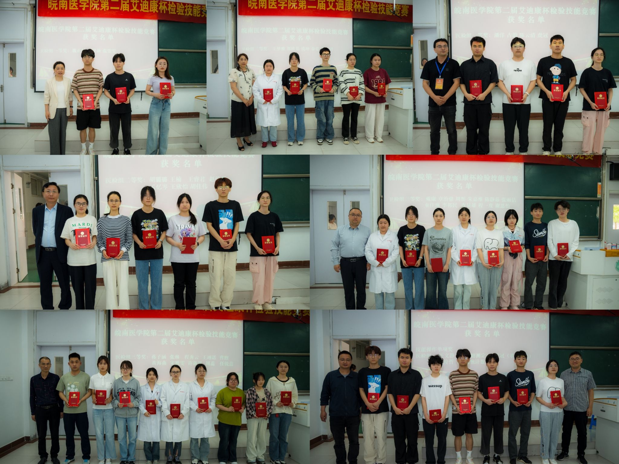 经过激烈角逐,虎冠等4名同学拔得头筹获医检组一等奖,张雯雯等3名同学获得卫检组一等奖;胡佳伟等7名同学获得医检组二等奖,王梦雅等5名同学获得卫检组二等奖;任锐意等10名同学获得医检组三等奖,谢思怡等11名同学获得卫检组三等奖;汪文静等3名同学获得医检组技能操作单项奖,周彤等4名同学获得卫检组技能操作单项奖。