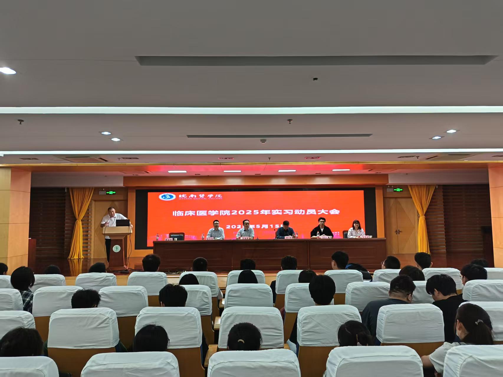 为扎实做好实习生思想教育及实习安排工作,5月15日,学院在滨江校区图书信息楼三楼报告厅召开实习动员大会,学院党政领导、实习年级辅导员及全体学生参加会议。会上,院长许力结合自己的学习工作经历,从实习生活的特点、转换角色、找准定位等三个方面介绍了实习生活。副院长陈祥攀介绍了实习医院的总体情况,并就本年度实习医院安排的方案向同学们进行解读。党委书记方基勇就实习管理、安全教育等方面对同学们提出要求,希望实习生提高认识,重视实习,做好规划,正确处理好实习与考研、就业的关系,提高安全防范意识,圆满完成实习任务。