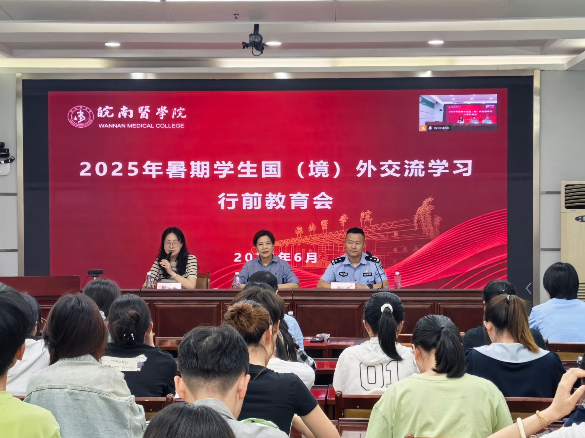 为护航我校学生出国(境)求知之路,筑牢安全防线,保障每位学子能平安踏出国门,安心完成学业,6月5日下午,国际合作与交流处(港澳台事务办公室)在图书信息楼十楼视频会议室召开2025年暑期学生国(境)外交流学习行前教育会。芜湖市公安局出入境管理局警官李杰,国际合作与交流处处长(港澳台事务办公室)赵梅、副处长(副主任)蒯文婷,项目主办方负责人,50名即将出国(境)交流的学生及40余位学生家长通过线上线下相结合的方式参会。会议由蒯文婷主持。