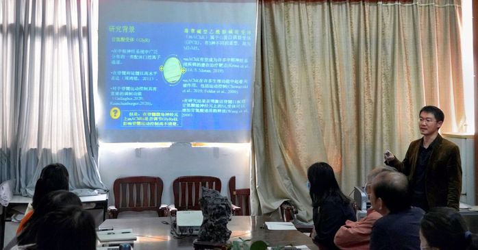 郑超博士以“单细胞膜片钳记录技术及其应用之一——毛果芸香碱对脊髓腹角神经元甘氨酸电流的作用”为题作学术报告。他根据自身科研经历,详细介绍了单细胞膜片钳记录技术及其应用,先后从膜片钳记录系统的设备购置、平台搭建、实验标本制备到记录模式选用都作了深入浅出地讲解,并着重强调了诸多实验细节,分享了自己及其研究生的最新科研成果。讲座结束后,在省级学术与技术带头人汪萌芽教授的带领下,师生们围绕学术报告展开了热烈研讨。