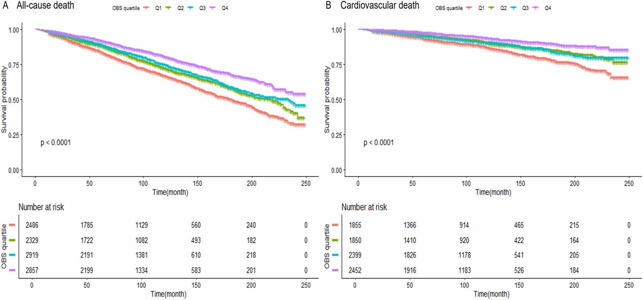 氧化应激被认为是糖尿病发生和发展的重要风险因素。尽管已有研究探讨了氧化应激与糖尿病的关系,但关于系统性氧化应激与糖尿病及糖尿病前期患者死亡风险之间的联系,仍缺乏深入的研究。氧化平衡评分(OBS)作为一种新兴的系统性氧化应激指标,通过综合考虑饮食和生活方式中的20种抗氧化剂和促氧化剂成分来计算,其高低反映了抗氧化剂暴露的程度。OBS是评估个体整体氧化/抗氧化状态的一个综合性指标,较高的OBS表示更强的抗氧化活性,而较低的 OBS 则表示更强的促氧化活性。